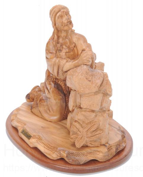 This beautiful statue of Jesus praying at Gethsemane is intricately hand carved from the lovely Holy Land olive wood with each statue being similar, but each one being a one of a kind original. The statue depicts the Lord Jesus kneeling in prayer, with clasped hands, and with His robe laid over a stone wall. The base of this statue of Jesus praying at Gethsemane is beautifully sculpted with intricate carvings and then situated on a mahogany platform to give the statue even more character. Ideally sized for a home setting and gift giving.